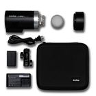 The Godox AD300Pro comes with the monolight, a single rechargeable Li-Ion battery, the flash tube, a charger with a power adapter, a basic reflector, a protective cap and a case to carry it all in.